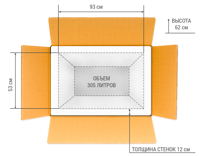 Медицинский термоконтейнер ТКМ-280. Внутренний объем - 305 л, габариты – 1200x800x870 мм, вес - 16,5 кг.